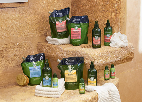 El poder de los aceites esenciales para cuerpo y mente. Nuestra colección eco-diseñada más completa. Botellas en R-PET, dispensadores recargables con eco-recargas y fórmulas Clean Charter.