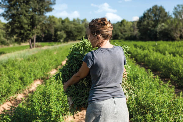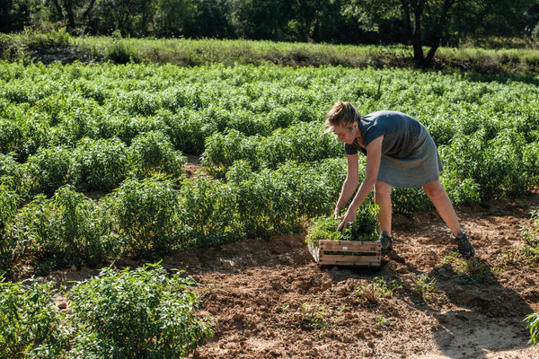 Todos los años, en mayo, nuestros productores replantan sus campos de Verbena porque este delicado cultivo no puede sobrevivir a los duros inviernos. Riegan cuidadosamente las nuevas plántulas y las alimentan con fertilizante orgánico tres veces durante la temporada de crecimiento. Las hojas cosechadas se secan el mismo día.