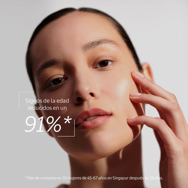 * Análisis de imágenes de las arrugas faciales de 38 mujeres de 45 a 70 años en Francia. ** Prueba de consumo realizada en 33 mujeres de 45 a 67 años en Singapur, resultados después de 3 meses de uso. Fórmula testada bajo control dermatológico.