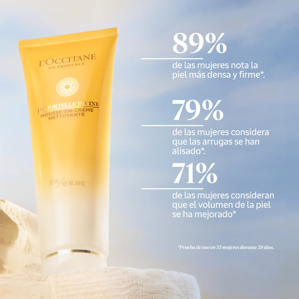 El Limpiador Cremoso Divina Siempreviva elimina eficazmente el maquillaje y las impurezas al tiempo que envuelve la piel con confort gracias a su textura de crema-espuma.