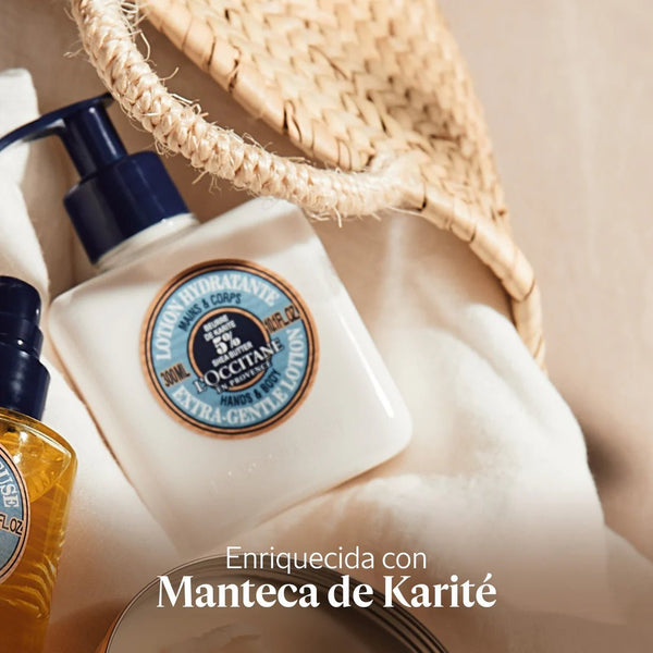 La loción hidratante de manos y cuerpo, enriquecida con karité (5%) ayuda a suavizar la piel y a combatir los efectos de sequedad. Su fórmula fluida y ligera permite una fácil aplicación y una rápida absorción dejando la piel delicadamente perfumada con un suave aroma a karité.
